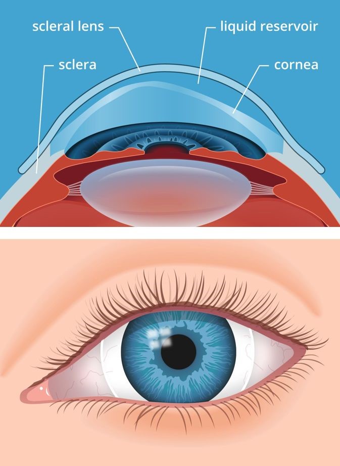 If your eyes are too dry for conventional contact lenses, scleral lenses can help. In particular, the space created between the back surface of full scleral lenses and the cornea acts as a tear reservoir to keep the front of your eye moister and more comfortable.